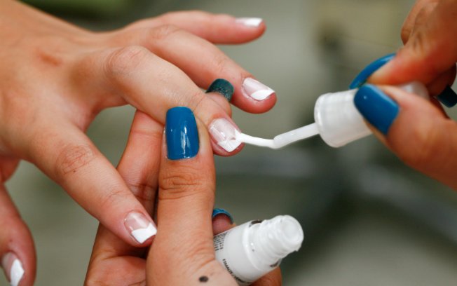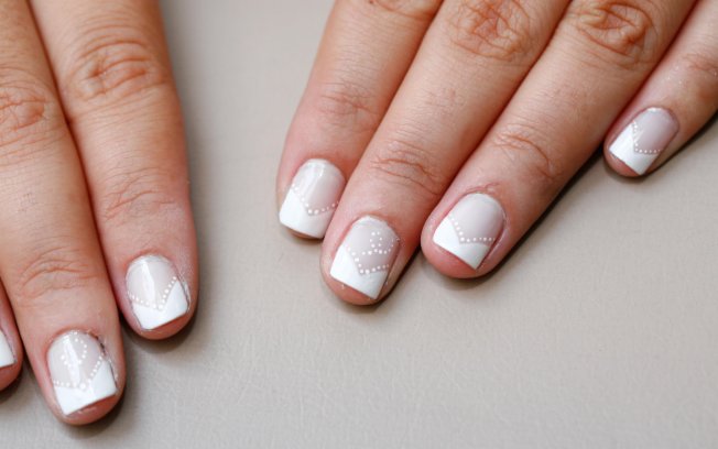 Depois de lixar e passar base, faça um “V” na ponta das unhas com o esmalte de unhas artísticas. A forma pode ultrapassar a linha branca natural