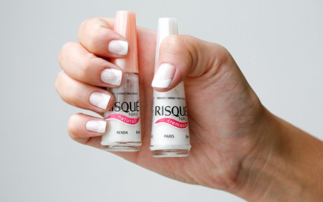 Para esse desenho são usadas duas cores de esmaltes. Optamos por uma versão com tons clarinhos, como o Paris e o Renda, da Risqué