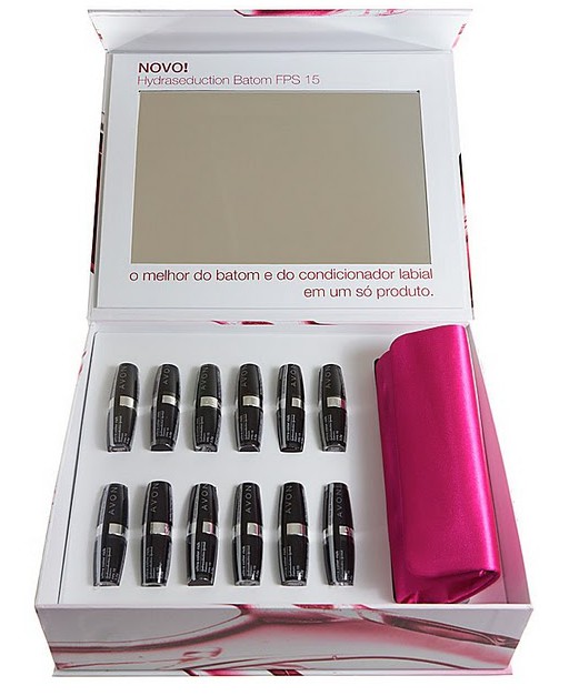 a caixa aberta tem espelho na tampa, com os 12 batons
